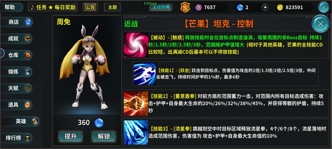 选择2技能开局,利用群伤和拳套的群伤快速清怪