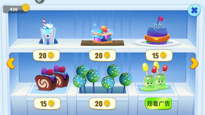 游戏中的食物可以分成这几类,甜品,水果,地方美食,雪糕等等.我们只需左右滑动即可切换,玩家可以根据需求,选择需要的进行购买。而且食物价格都不会很贵,大多数都是可以用金币进行购买,采购起来轻轻松松。