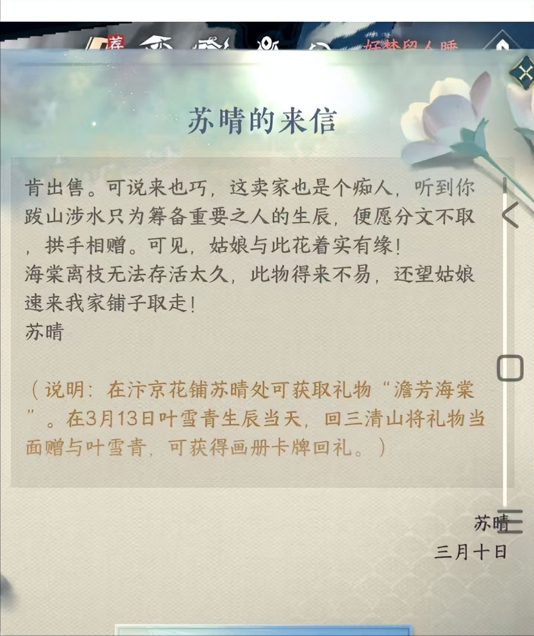 2、3月13日玩家去三清山(1201 943)找师姐叶雪青,给她出示【澹芳海棠】赠送给她就可以;可以解锁师姐的生日卡片。