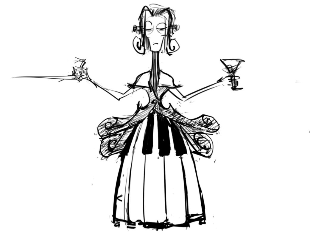 因此,我们转变了她的风格,将她刻画为了一名沉迷于艺术的绝对脱产者,手中的酒杯,琴键般奢华的裙子,映衬着她的小资情调,她沉迷于自己的“高雅”生活,偏执的自恋,甚至她对于周遭的生活,自己的年老容颜,迂腐的思维和性格毫无认知。