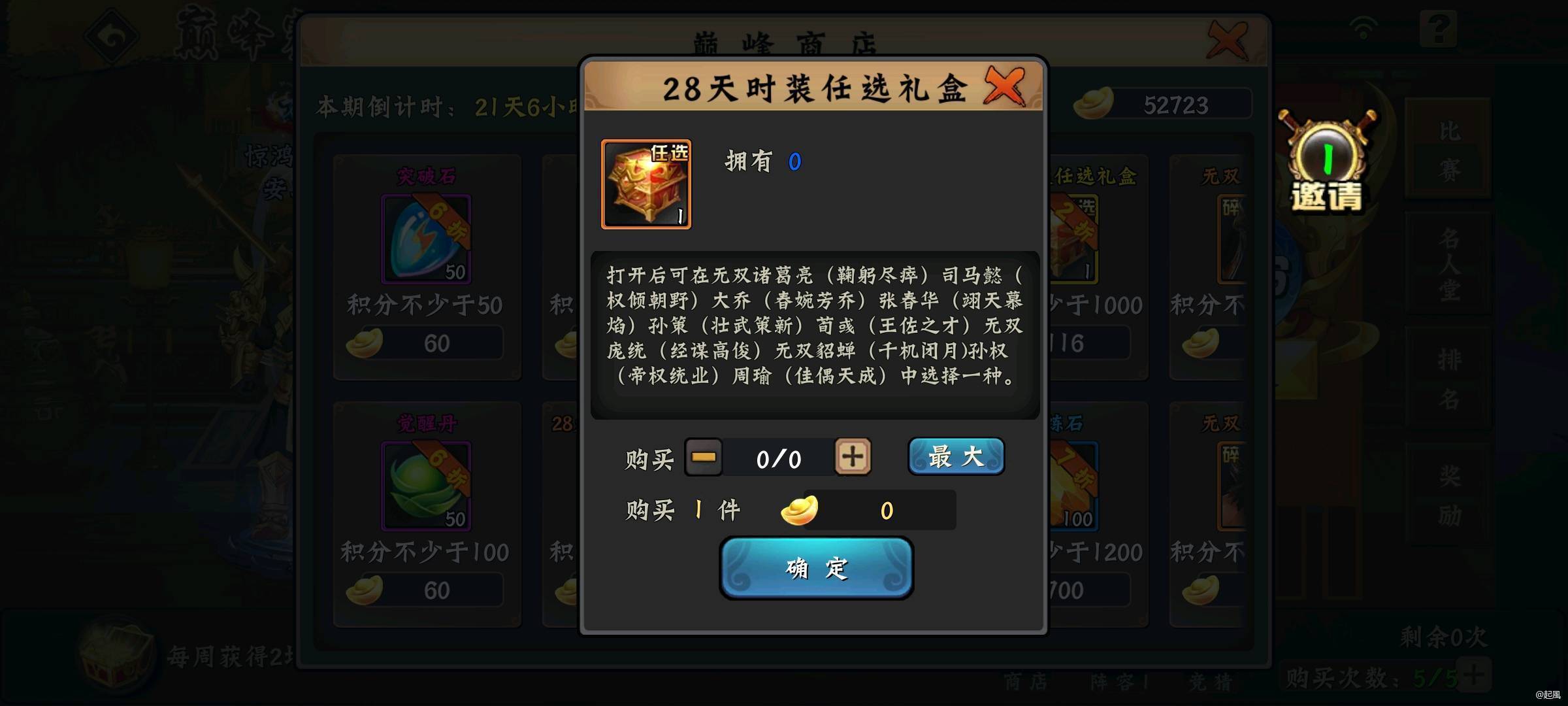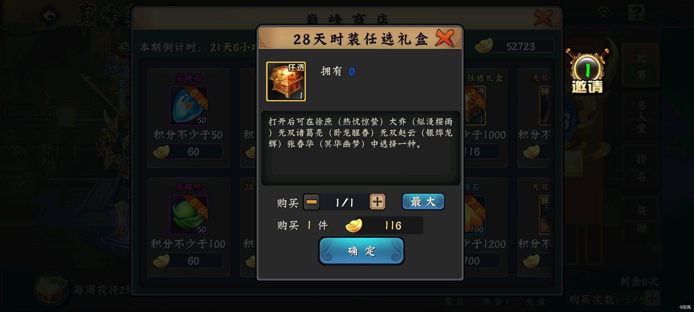 每个月重置一次,每周日晚上8-9点之间会有巅峰赛对决,商店每月会刷新一次,重置出各种武将的限时动态皮肤以及永久特效皮肤。
