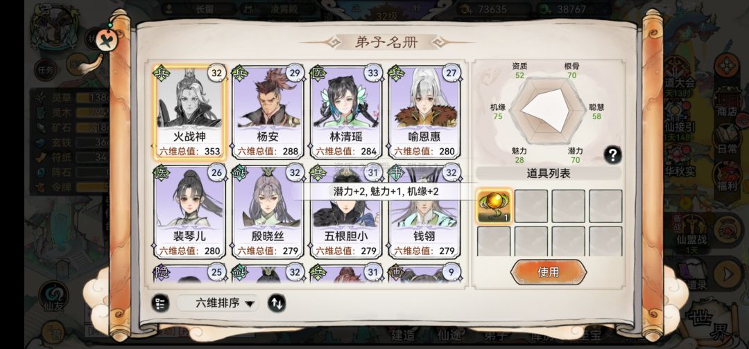第三步,吃九转,泡天衍池,后山25层开放,第一次消耗300w灵石和200w矿石,可以直接洗掉道劫,一个新属性的好天命弟子就诞生了!至于能不能变逆天,要看你的弟子有没有六维词条!