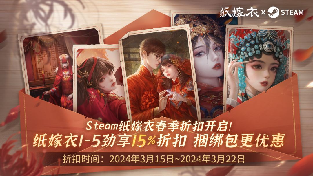 3月15日起,《纸嫁衣》《纸嫁衣2奘铃村》《纸嫁衣3鸳鸯债》《纸嫁衣4红丝缠》《纸嫁衣5来生戏》纸嫁衣Steam五部曲皆享15%折扣!