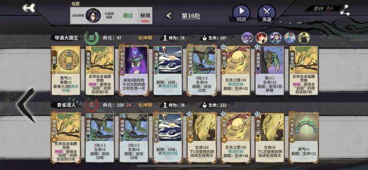 前期随便打,进阶金丹后开始刷牌,主要为了海底捞月和螳螂捕蝉两张能用到通关蓝卡,其他四张就是兑卦、众星捞月、星羿.打和副职的以画入道(这张牌化神期再用必出金牌)