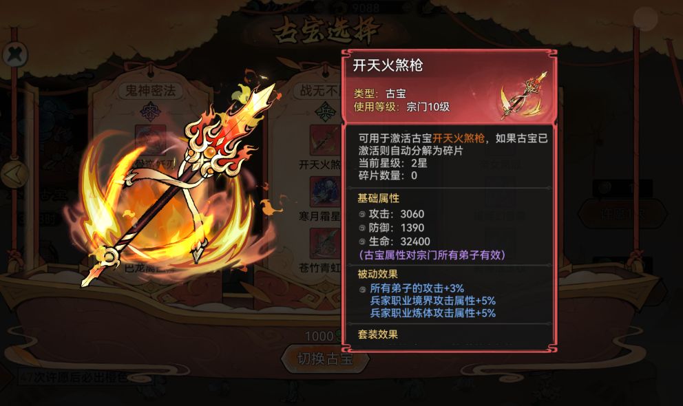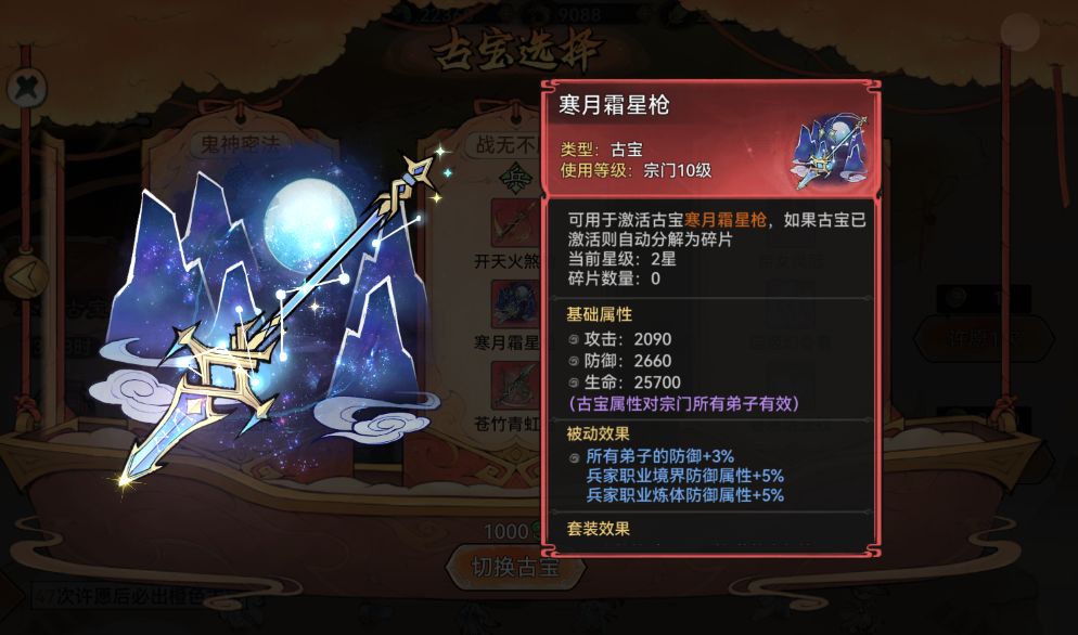最后可以选择寒月霜星枪,虽然这个古宝侧重防御方面,比起另外两个古宝来说性价比不算高,但不要忽略了3个古宝凑齐所带来的套装效果也是十分强力的。