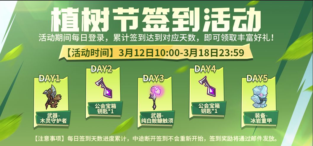 【注意事项】每日签到天数进度累计,中途断开签到不会重新开始,签到奖励将通过邮件发放。