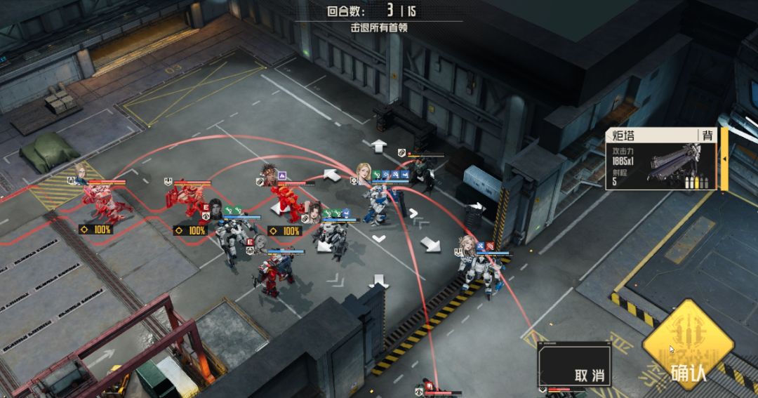 由BOSS的天赋和技能我们可知,这个BOSS的反击伤害是很高的,而且会强化并修复手部,所以我们尽量选择优选攻击BOSS的躯干以打到快速击杀的目的。值得注意的是BOSS的射程为3格,除了AOE角色,我们用狙击手也是可以安全地进行输出的。