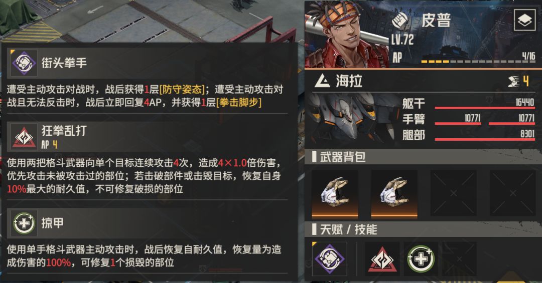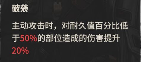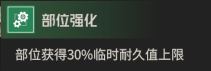 天赋第一部分为战斗开始时,BOSS随机使自己一个非躯干的部位获得部位强化,效果为临时增加30%的耐久上限。主动攻击战后随机使自身1个未破损的非躯干部位获得部位强化。