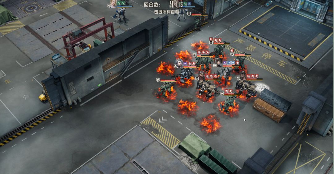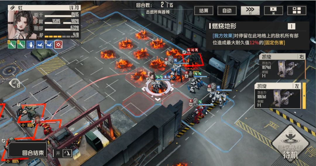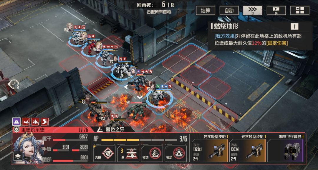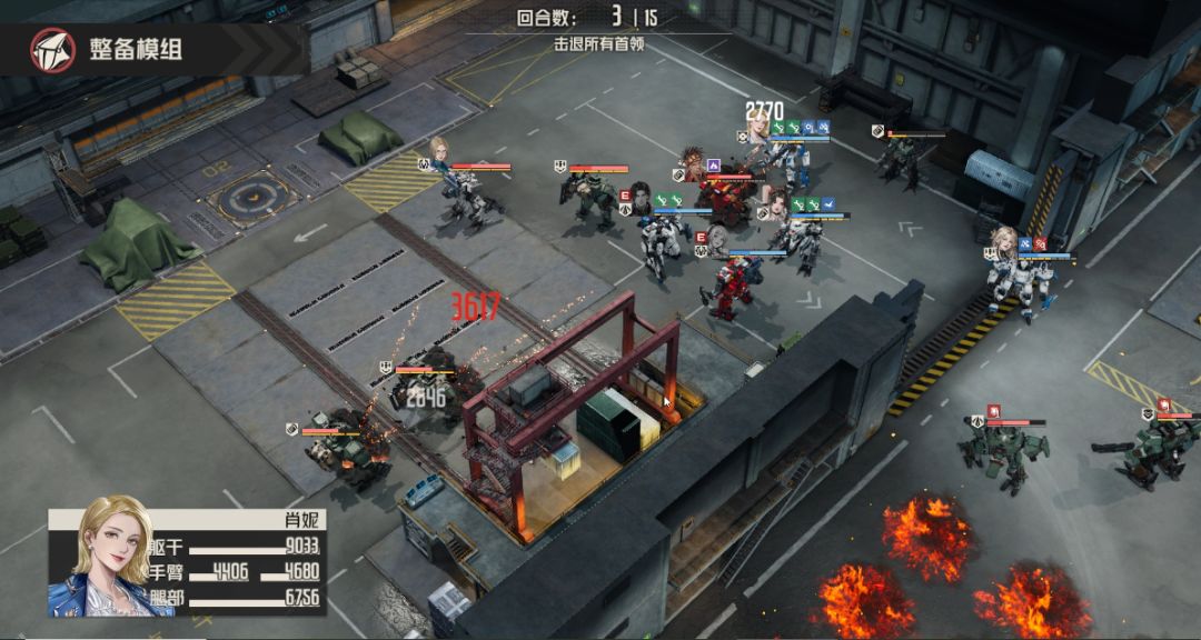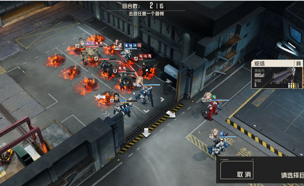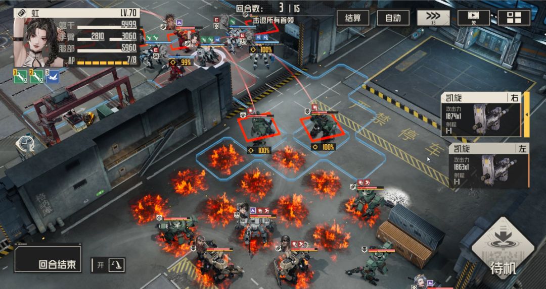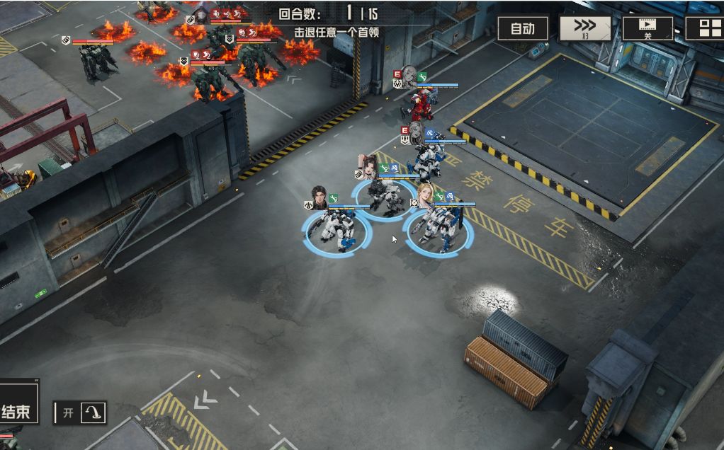 艾琳继续铺地火,其它人收掉首领一并回复状态,这里可以躲在两侧的墙后防止被首领二的大范围电磁炮击中太多人,下回合准备击杀首领二,本回合结束后,首领三也会上前攻击我们,分摊伤害即可,如果运气不好被爆头了就回溯凹一下吧