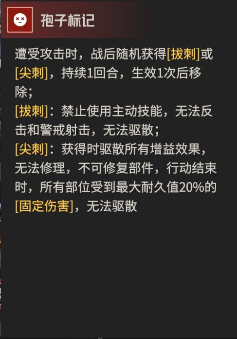 被施加孢子标记的角色,遭受攻击时,还会随机获得尖刺或者拔刺异常状态,其中无法使用主动技能和无法修理都是比较难受的异常状态。