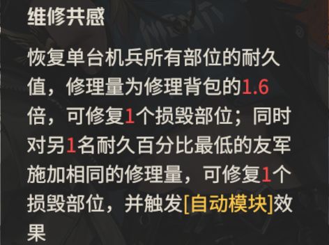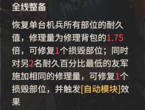 首次整体血量低于50%时会修复双手的20%耐久,且可以修复损坏的手臂,并随机使一个未破损的部位获得部位强化