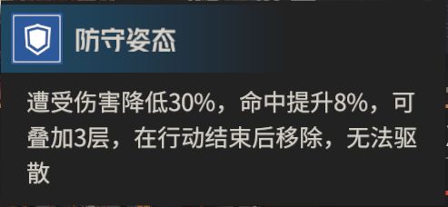 该BOSS的天赋第一部分为被主动攻击对战后获得1层防御姿态BUFF,该BUFF每层给BOSS提供30%减伤,8%命中,最多叠加3层,这是一个非常高的减伤BUFF.