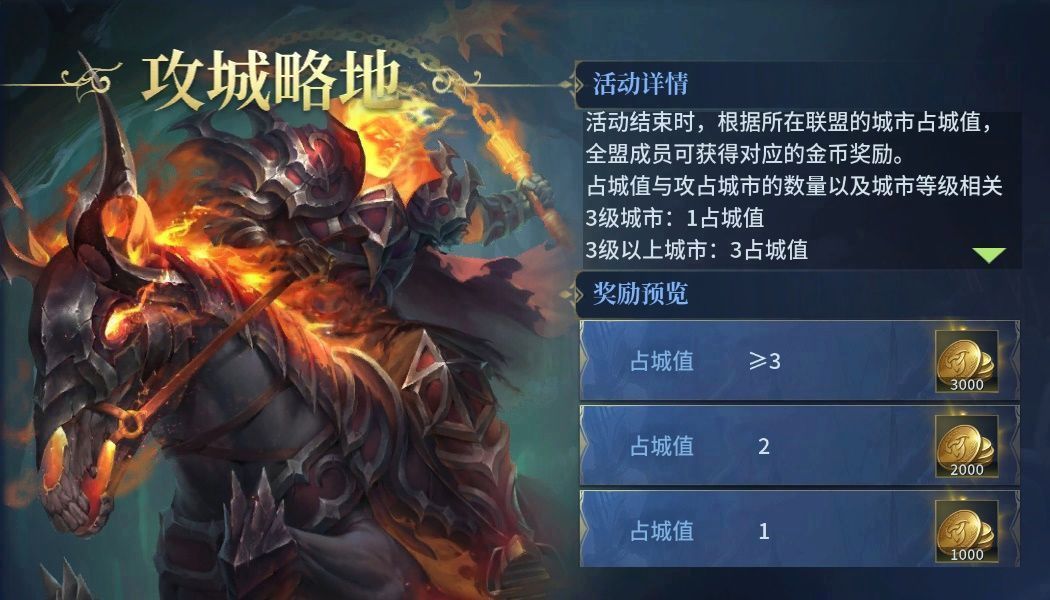 开服后,在游戏中可以攻占城市获得占城值,活动结束时满足条件则可获得大量金币奖励!