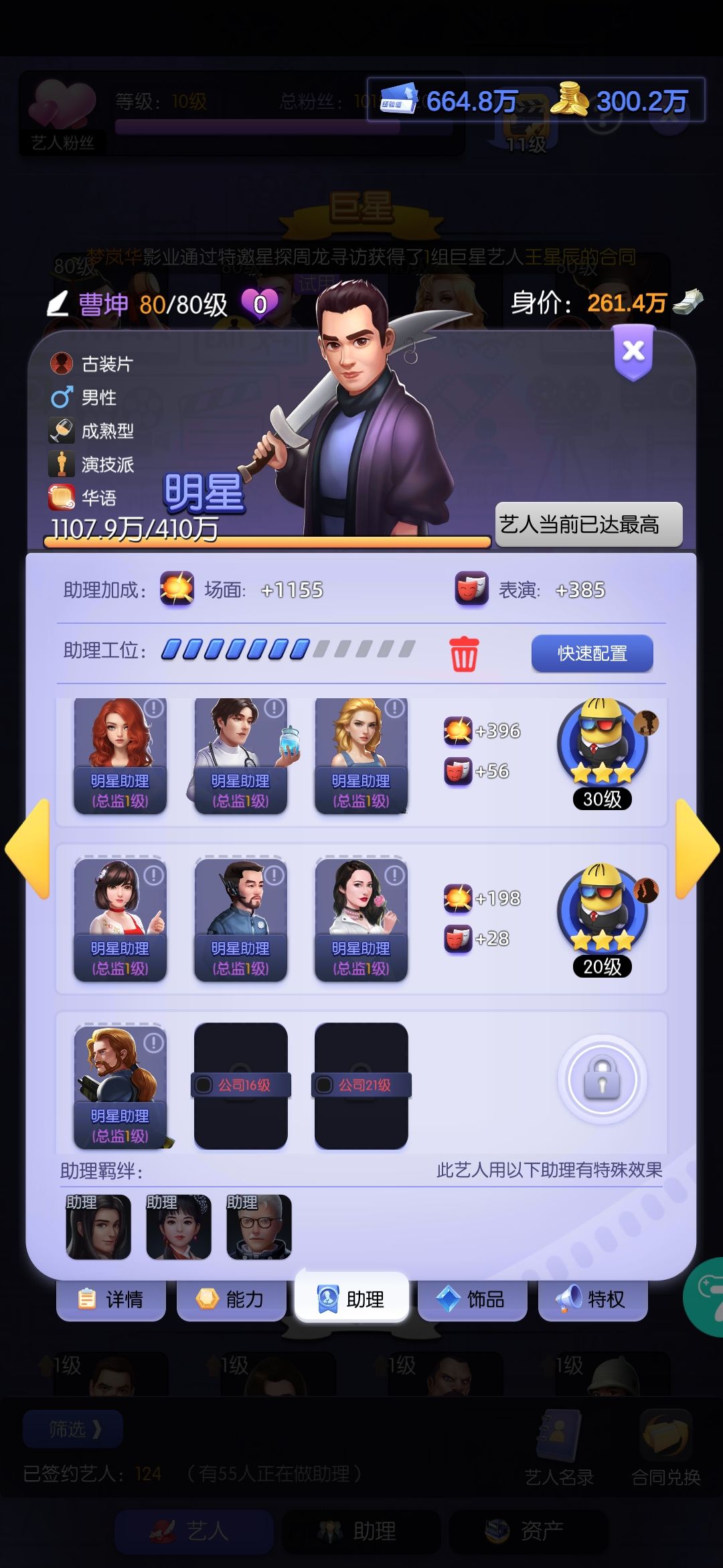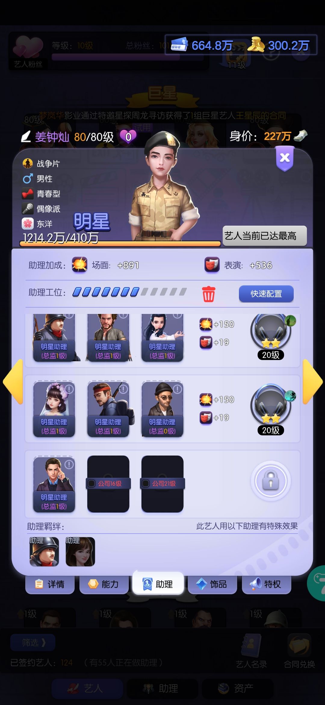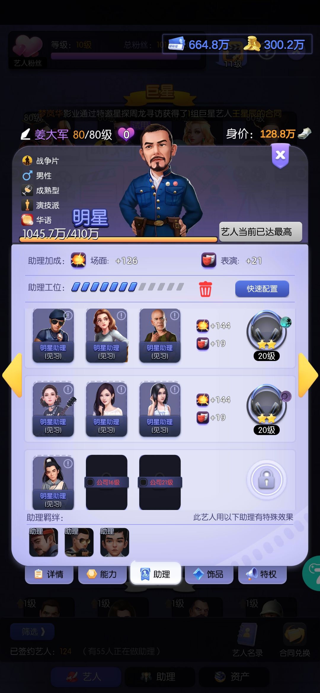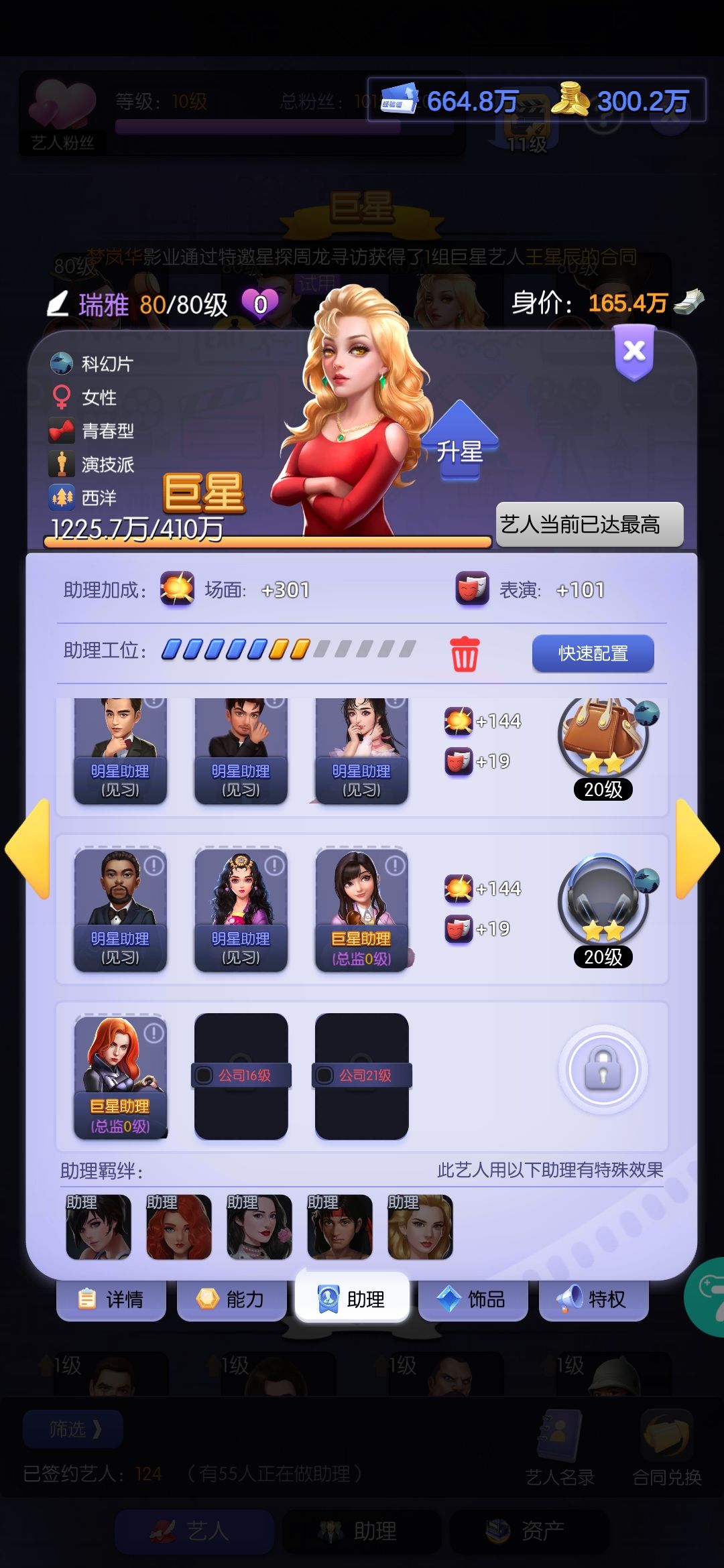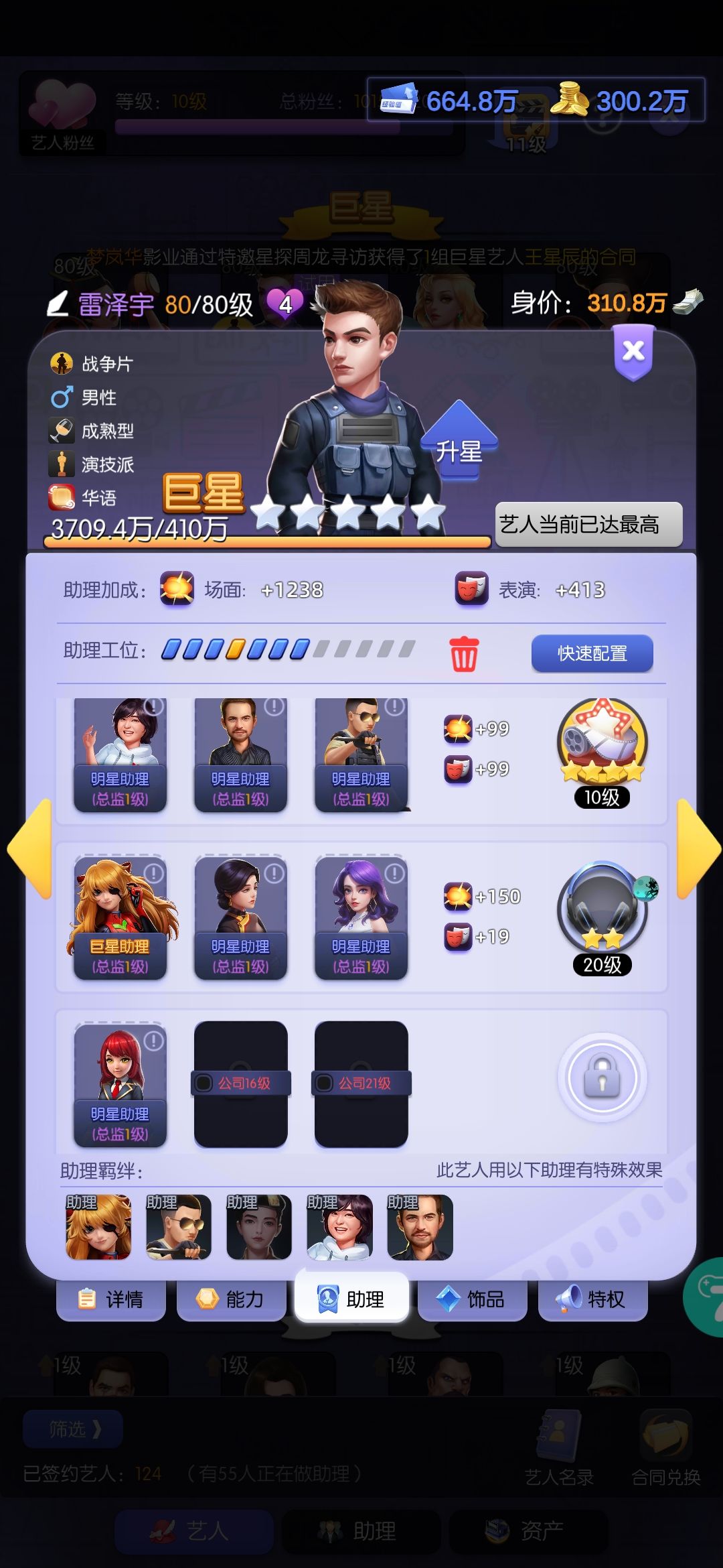 接下来每天正常升级+破档,影院和挑战任务必做,机器人的钻石礼包必买。都关系到第八天出江中灿。抽卡出了科幻巨星以后就一直抽战争。助理优先雷龙的到总监1就可以,不要平均升。每日榜和区域赛排名刷高点,如果有艺人评分,就把雷龙的助理和装备换给需要的,每天先看排行榜需要啥,刷对应的:比如投资,剧本种类啥的。商店奖杯换合同,积分换升星卡,其次合同,给雷龙升星开技能。雷龙150。姜大军主3副2,张翼主3。