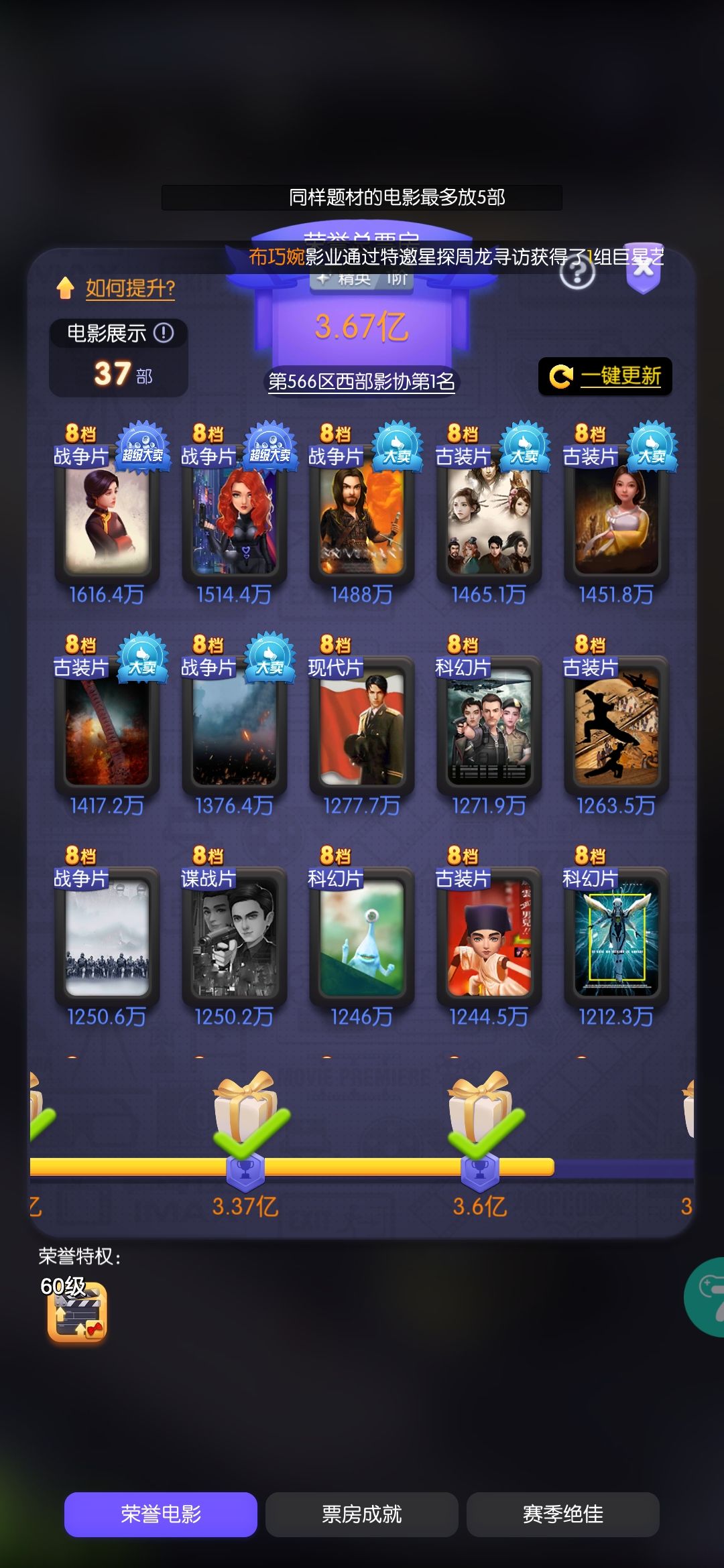 接下来把等级提升到四级,3个战争人物升到40级(评论区发礼包码资源够用),开始破4档,破4以后全部版权部的第一个提高收入必点满,全换上4档电影,宣传满了,加速卡完成,这个时候每小时收益基本220-450万,把钞票卡用了,爽推一波市场。然后继续做任务。第一天至少是能7级5档的,运气好就是8级6档。