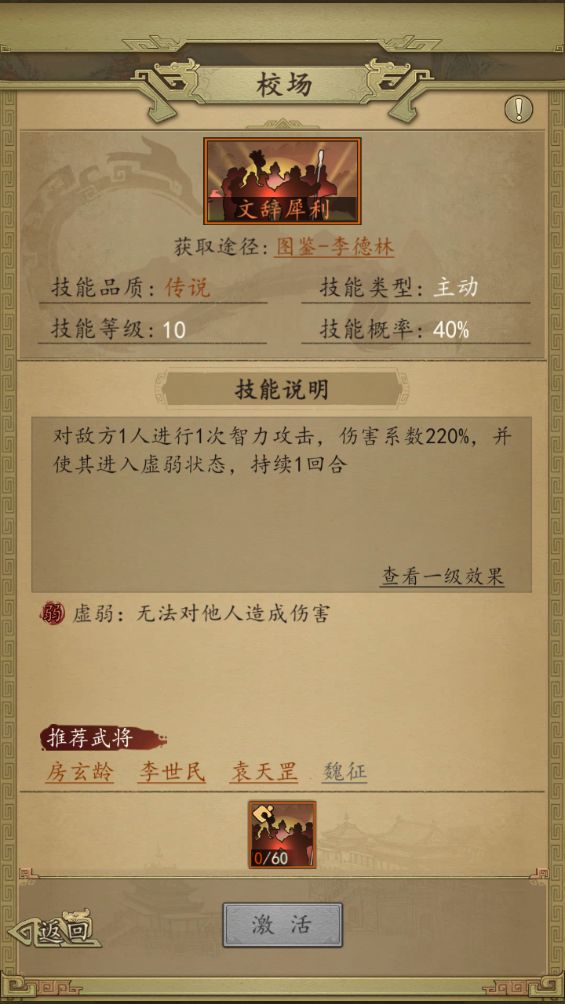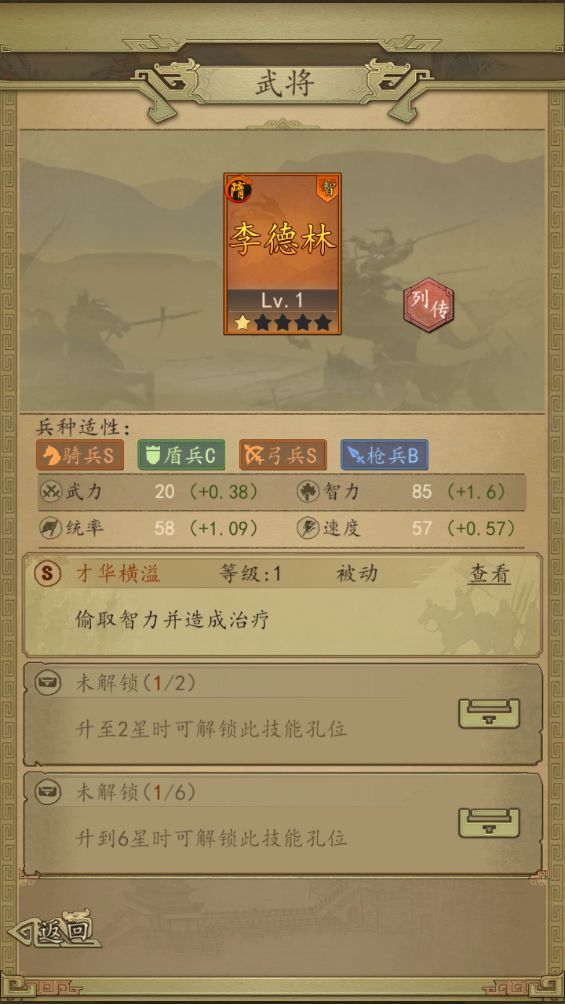 点评:普普通通的智力武将,智力成长高于平均值,其他属性均低于平均成长值。没有羁绊,自身技能一般(才华横溢),图鉴技能不错(文辞犀利)。不出意外,又是一个酱油角色了。