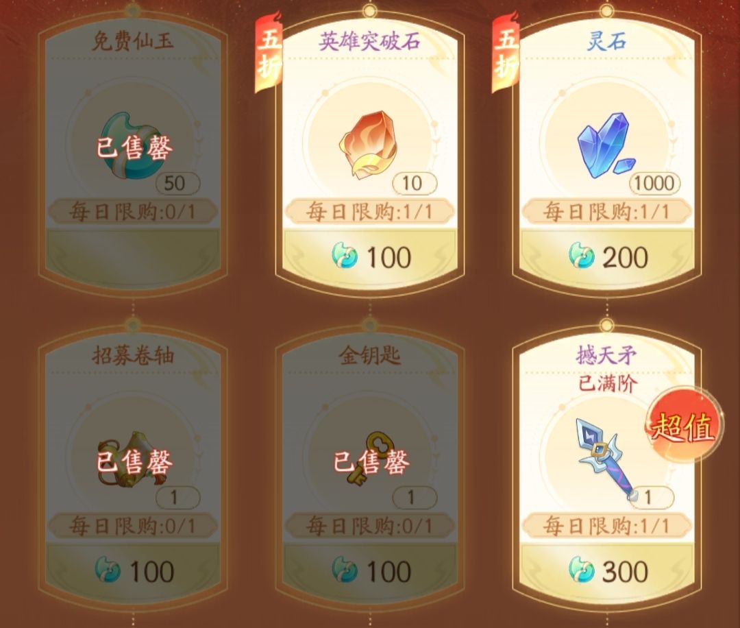每日商店:免费仙玉>刷出来的金卡角色>刷出来的金法宝>刷出来的金卡碎片>打折招募和金钥匙