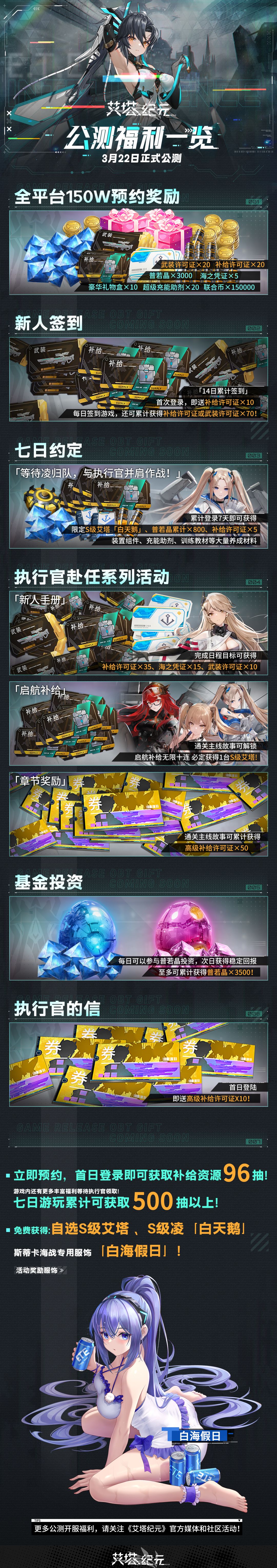 《艾塔纪元》将于3月22日公测啦,我们也早已为执行官们准备了超级超级丰厚的福利——全平台预约奖励、新人签到、七日约定,还有执行官赴任系列活动……公测首周累计可获得500多抽!对了,还有斯蒂卡的海战服饰「白海假日」,详细的福利清单,请见下图(*^▽^*)