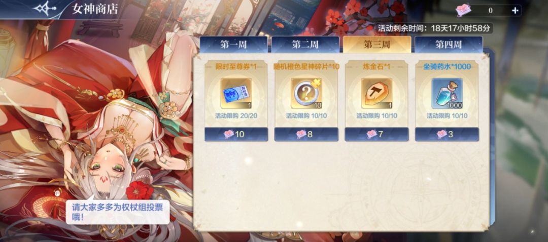 七、【女神商店】活跃兑换得限时至尊券&星神碎片