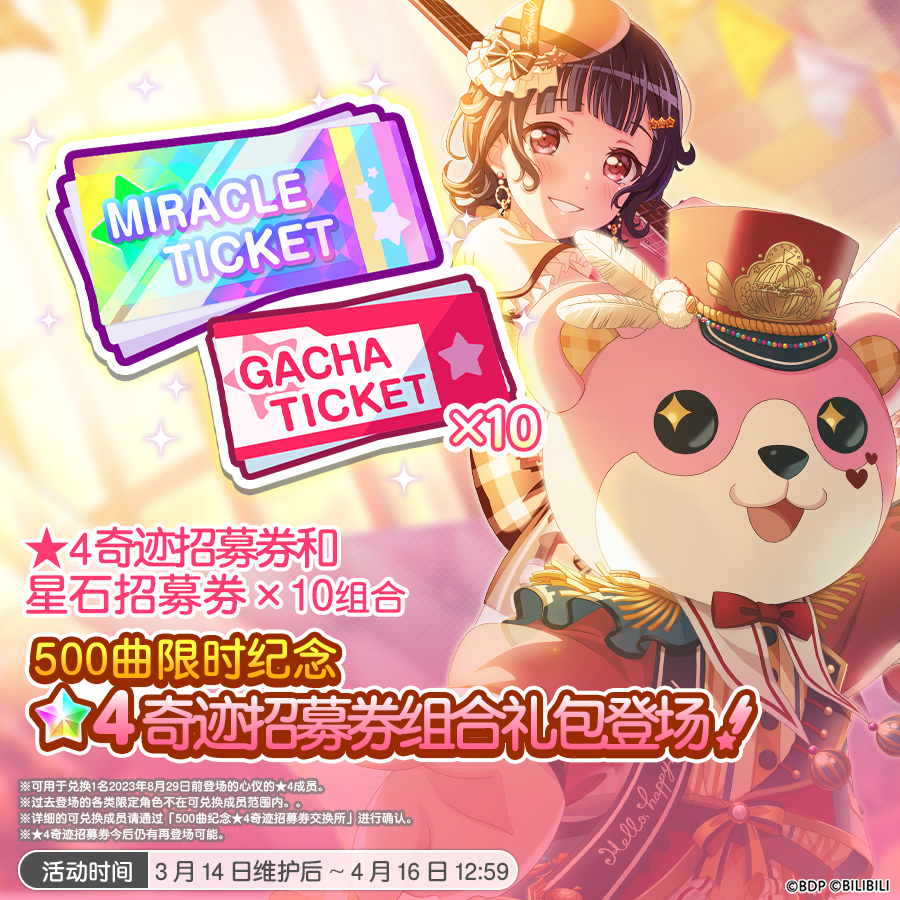 ※「500曲纪念★4奇迹招募券」可在「500曲纪念★4奇迹招募券交换所」内兑换1名2023年8月29日前登场的心仪的★4成员,不包含2023年9月7日后登场的★4成员。