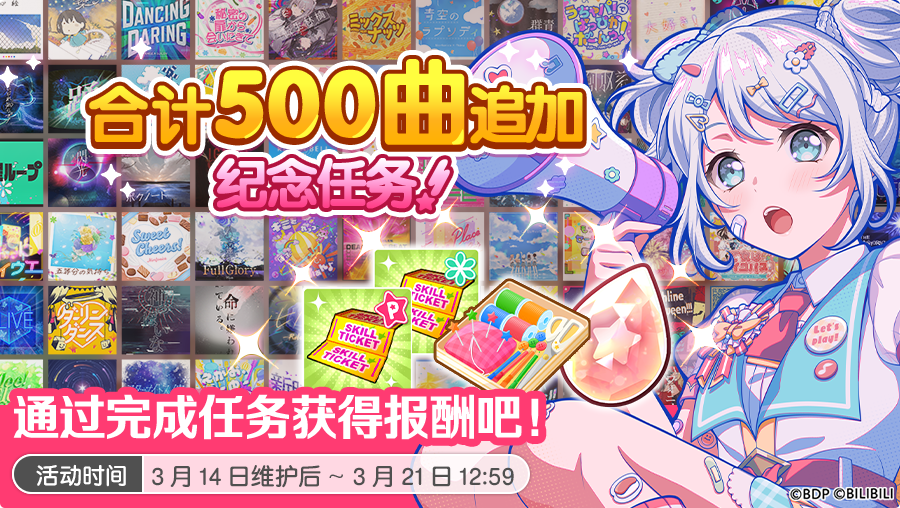此外,游戏内还将开启「500曲纪念任务」&「500曲追加纪念 登录奖励活动」,并上架限时纪念礼包,内含奇迹招募券可供购买!欢迎进入游戏查看~