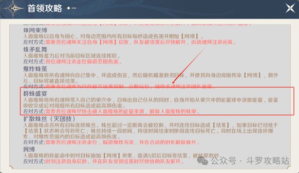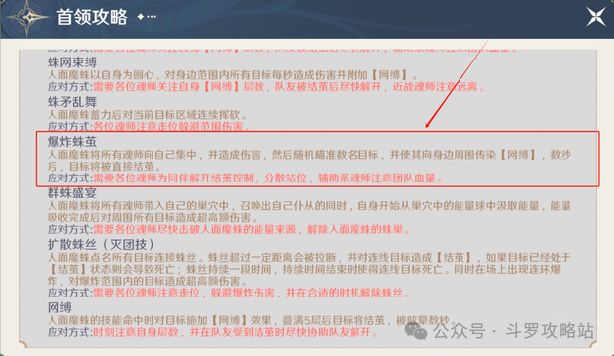 应对方法:技能开始的时候boss会在天上,然后拉丝,此时观察自己身上的蛛丝颜色,变红色的话代表线要断了,紫色代表安全,然后前两波爆炸比较慢,到后面越来越快,第一波爆炸时按照顺时针方向躲避,就可以轻松躲避爆炸;爆炸结束后boss会下来,这时候要一个接一个的人输出人面魔蛛使线断掉,线在身上会降低输出,断线后会进入结茧状态,此时其他队员帮忙解除结茧状态。