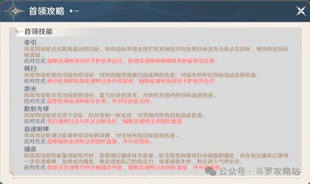 凤尾鸡冠蛇技能:牵引、横扫、激光、散射光球、音速咆哮、捕食