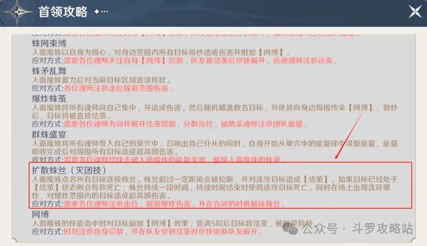 扩散蛛丝技能介绍:人面魔蛛点名全部玩家并连接蛛丝,当蛛丝超过一定距离时会拉断,此时会直接被结茧。如果该玩家拉断时正好处于结茧状态时,则会被秒杀;蛛丝持续一段时间,时间结束后会直接秒杀被连着的队员,同时场上会出现连环爆炸,对范围内的玩家们造成巨额伤害