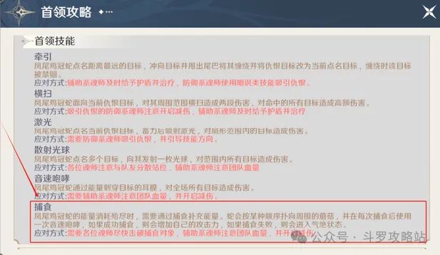 捕食技能介绍:每隔一段时间,凤尾鸡冠蛇会捕食补充能量。场上会出现四个蘑菇,凤尾鸡冠蛇会按照顺序捕食,捕食成功一次会增加攻击力并释放一次音速咆哮,如果捕食失败会陷入气绝状态。
