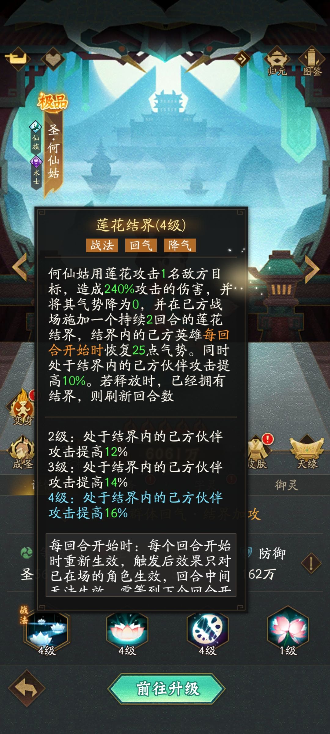 2)在己方战场施加一个持续2回合的莲花结界,结界内己方英雄每回合开始时恢复25点气势,同时提高己方全体16% 攻击力