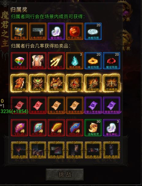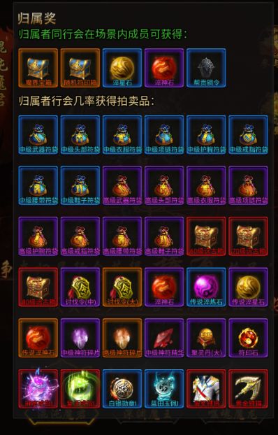 魔界入侵:第一次合服时出现的玩法,每晚20.30会出现三只boss,每个人只能每天选一只boss,boss图为跨服多人图,届时可以约着行会里的小伙伴一起攻打。无论是否抢到归属,怪物都会掉落物品并加入行会拍卖场内(拍卖场在商城里面进入)符印玩法也是这个时候出现。下图为部分可能掉落的物品