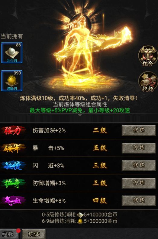 2、经脉:前期并不建议点这个来提升战力,因为它异常消耗金币和元宝,在你81级前每天的金币都不会够用的!即使到了不缺金币的时候,也不建议微氪、中氪、白嫖玩家去点。因为炼体更加耗费金币,并且分为十级,每升级失败一次都会直接清零等级!