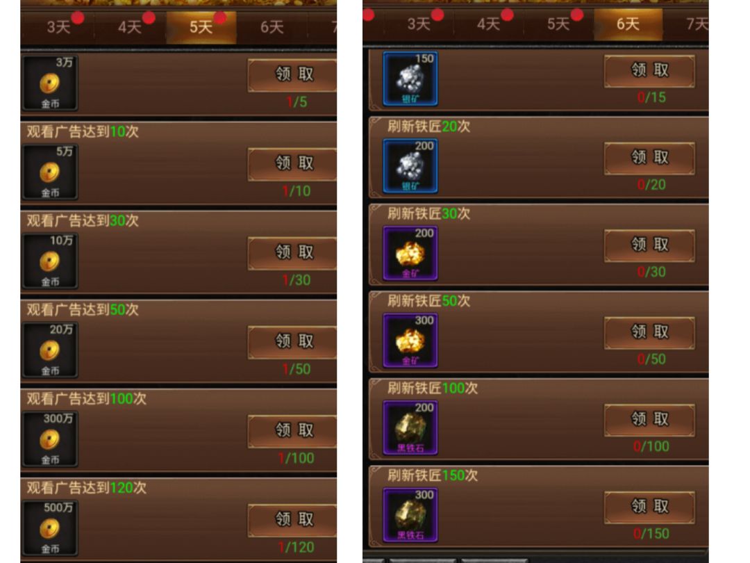 4、七日狂欢任务,这个粗略讲一下,大家按照任务要求去做就好,里面的每日好礼其实是原价出售,各位按需购买即可,只有第一天的25元买60个格子是永久限购,其他物品都会在各种活动时打折出售。另外需要特别注意的是第五天的广告助力任务和第六天的刷新铁匠任务,很多人往往会错过这两个的任务要求。刷新铁匠很简单,在玛法图标里的每日任务点刷新铁匠的去完成就会弹出刷新选项,或者去各个城镇里寻找。重点要讲的是看广告,很多人不知道有哪些看广告的地方:1、游戏最上方金币左边的铜币图标,点这个图标,每天都可以领取50W的金币。2、背包扩展、刷新铁匠、死亡后复活。3、关闭游戏的托管功能,下线6分钟在上线的双倍领取(只有这个是不限制次数领取,如果缺的次数太多,这个方法可以助你完成任务)