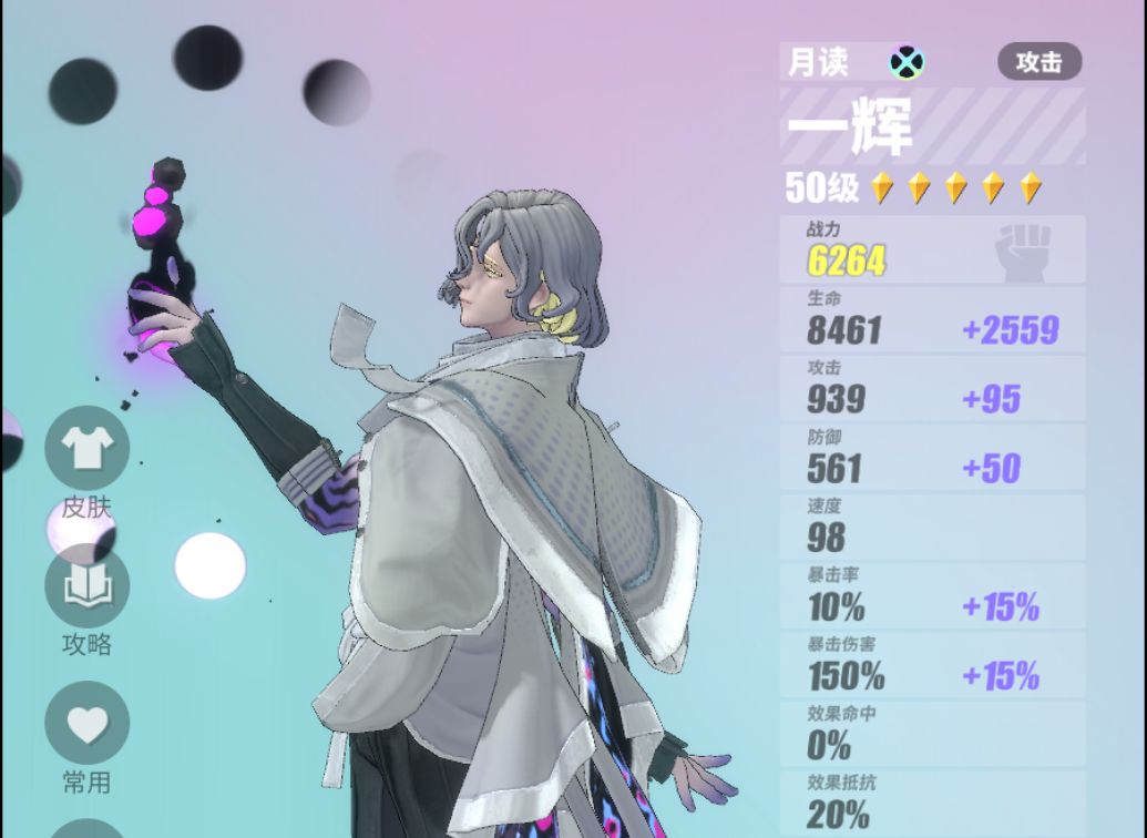 闪耀五星,攻击,一辉开场隐匿,反伤后手。打着打着你自己就没了。每次敌方主动释放技能或者反击后,将会受到一辉攻击力50%的伤害(会暴击)。同时为自己增加一层增益,自己有4层时驱散敌方全部增益并击退20%。不会失手,不会被抵抗。(自动释放,释放前清除所有自身控制效果)
