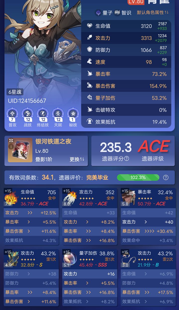 ),但强度确实高,有专武还能+10爆击,且正在卡池,应该没有人不会抽吧!量子C我用的是六命青雀,有希儿的话,尽量用希儿,听说差不多!