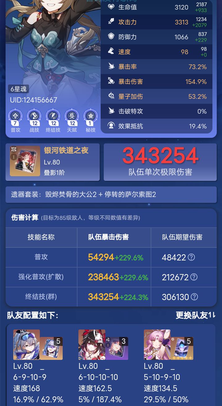 然后我突然想起来花火的行迹,我刚好还有符玄和银狼,再加上一个很久以前行迹拉好的青雀,因为之前一直是3命,在花火池才满的,就一直没有用过,所以就从来没有刷过量子套!于是随便带几个好点的,凑面版!