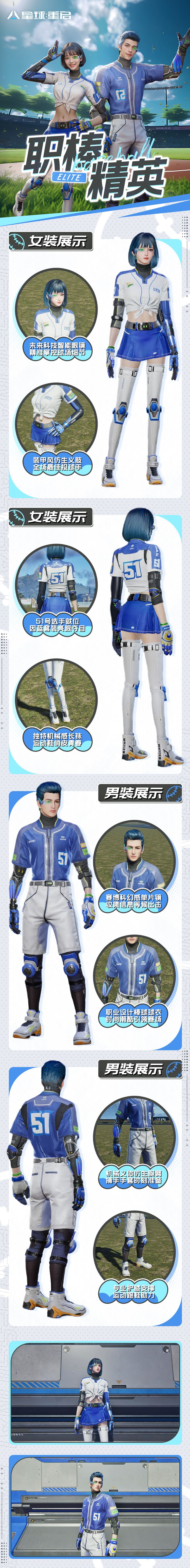 全新时装「职棒精英」为设计感满满的棒球赛服,蓝白配色干净明亮,未来机械手臂与科幻镜片酷炫十足。