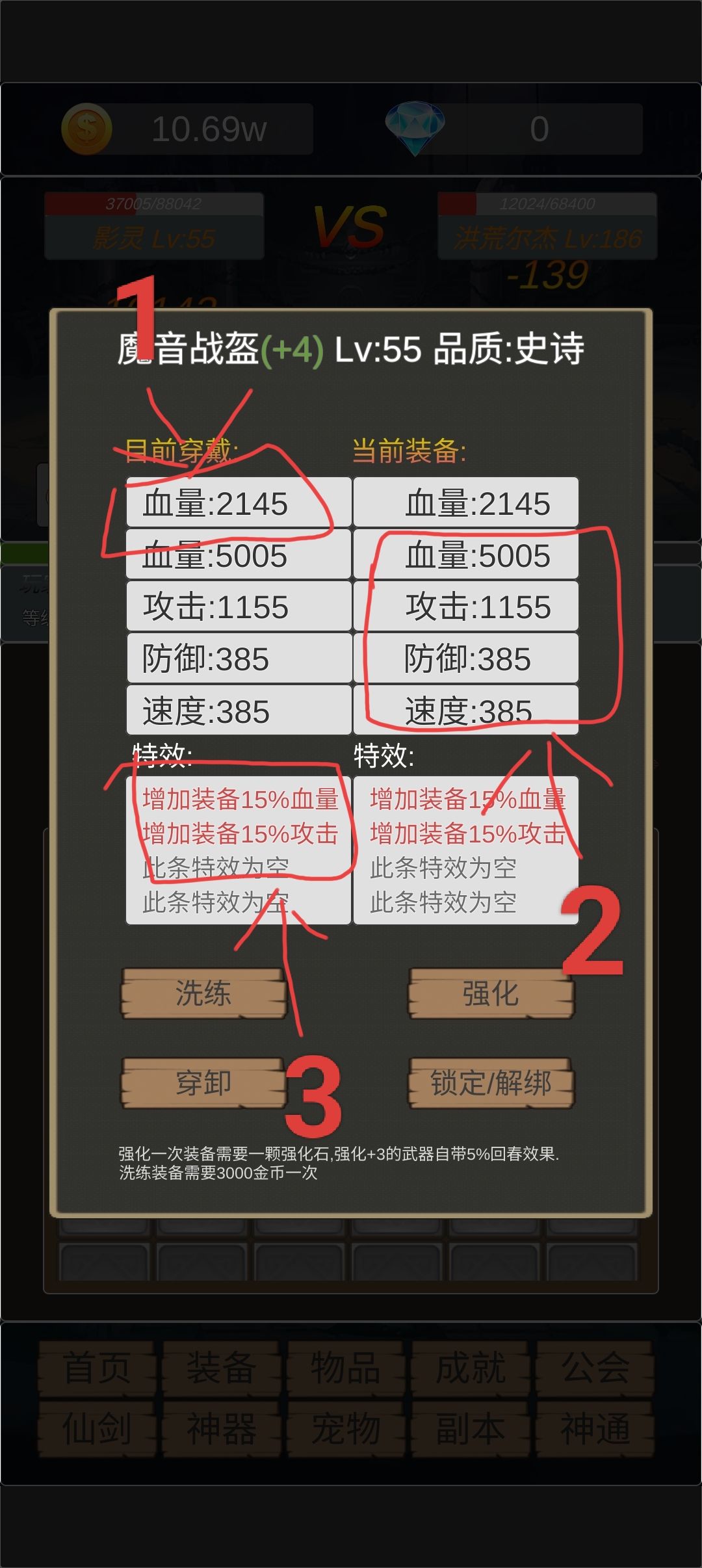 词条不建议洗练太多,随便洗洗就好,血量优先,太耗费金币,提升细微(ps:强完洗完记得锁好)