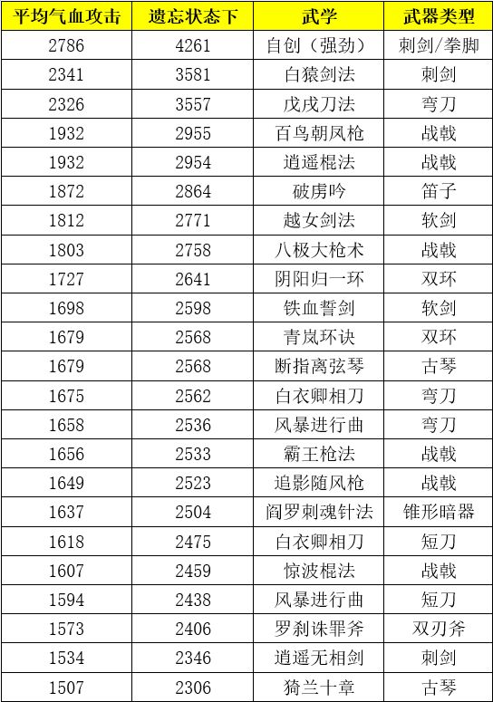 可以看出,绝大多数武学平均气血攻击都不会超过2500,即使风暴进行曲在技能遗忘期间,也只是微微超过。