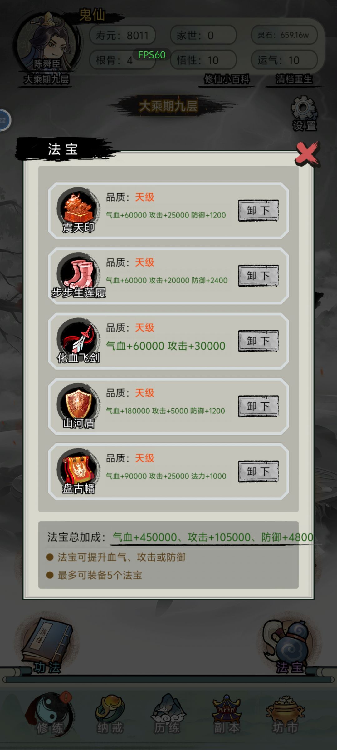 选择鬼仙模式,必须要有功法《百鬼夜行》(通过击杀剧情中的女鬼获得),我是在第一次升仙大劫失败后,寿元耗尽,转修鬼道。(注:百鬼夜行需要10级)成为鬼仙后,自身法术清除,寿元变成9999,功法变成《天魔解体》,悟性和气运也会降低。