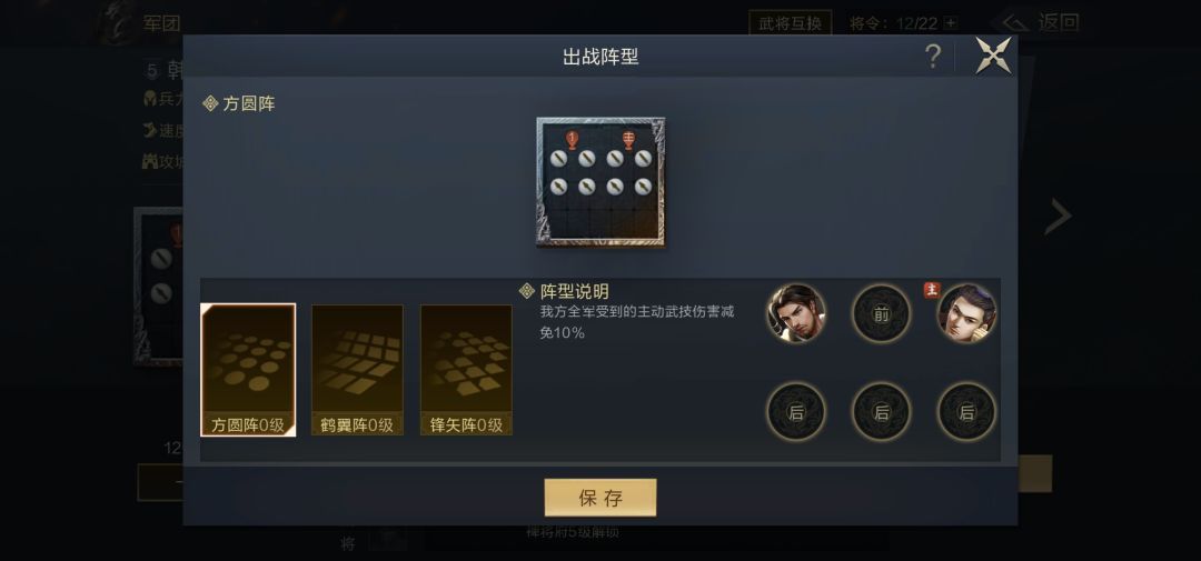 如图,点开队伍配置,左手边方圆阵点进去,就可以调整站位了,萌新打高级地之前,可以用副队带一个兵撞一下,然后看战报回放,摆位124或者125或者236都行,这是你俩近战一弓兵的情况,如果其他的阵容,就用你物理输出将对准敌方主将,胜利简单很多。。打高级地之前,记得查看守军,如果连击技能多用鹤翼阵,主动技能多用方圆阵,迅速爆头就用锋矢阵。熟练作用,可以让你的战损更低,起飞更快。