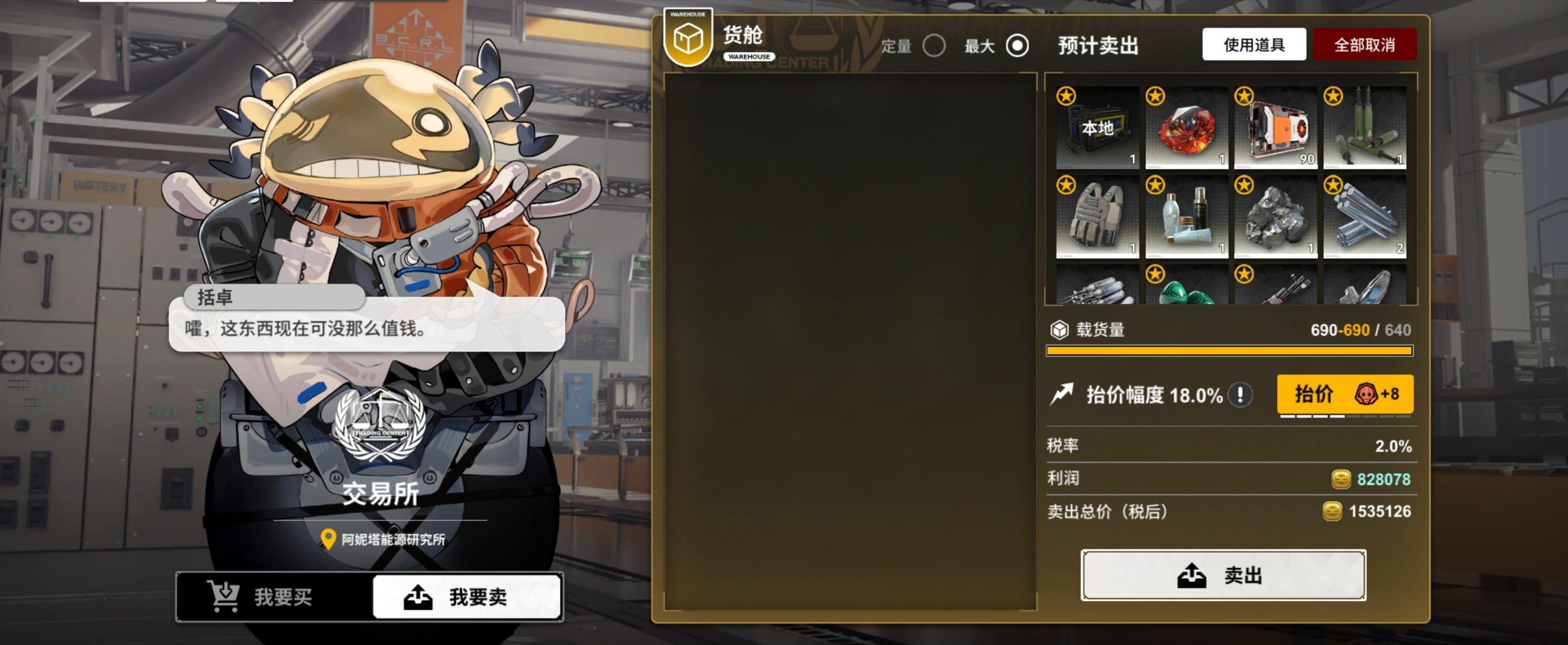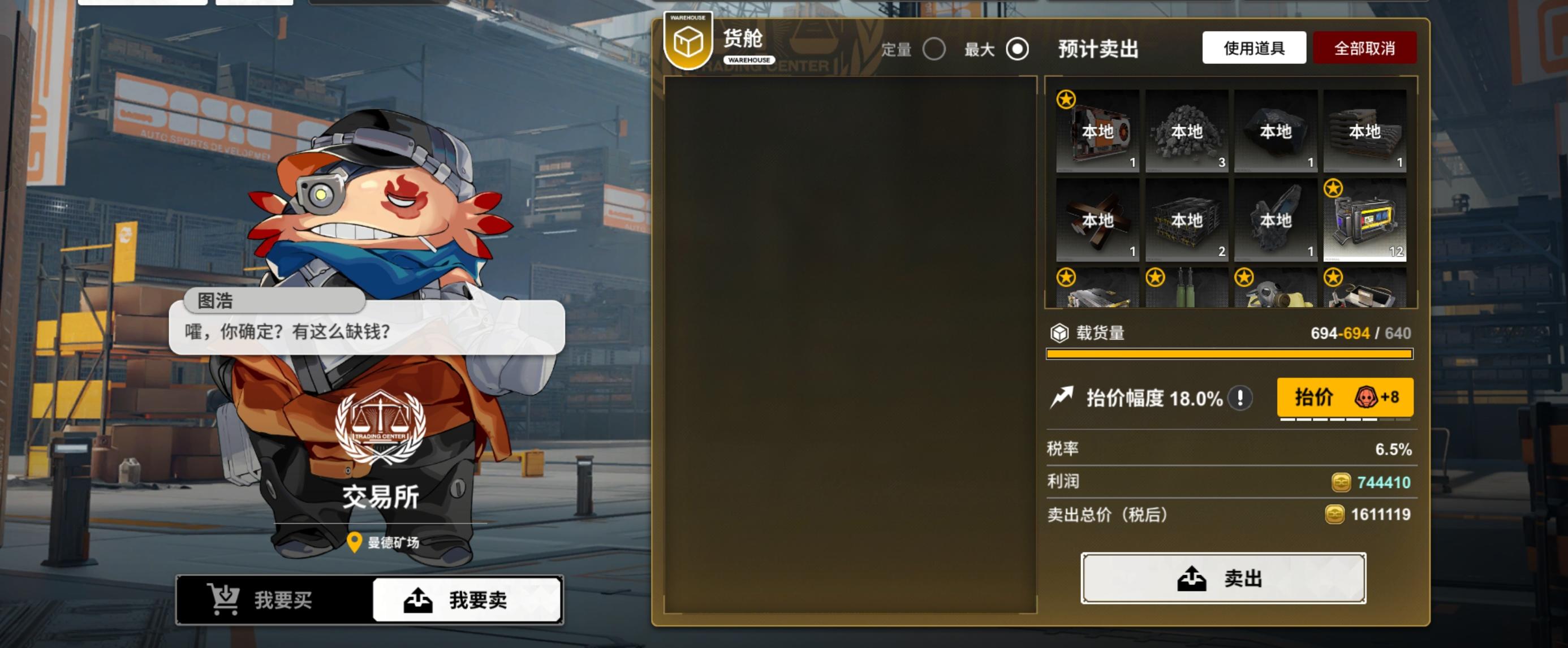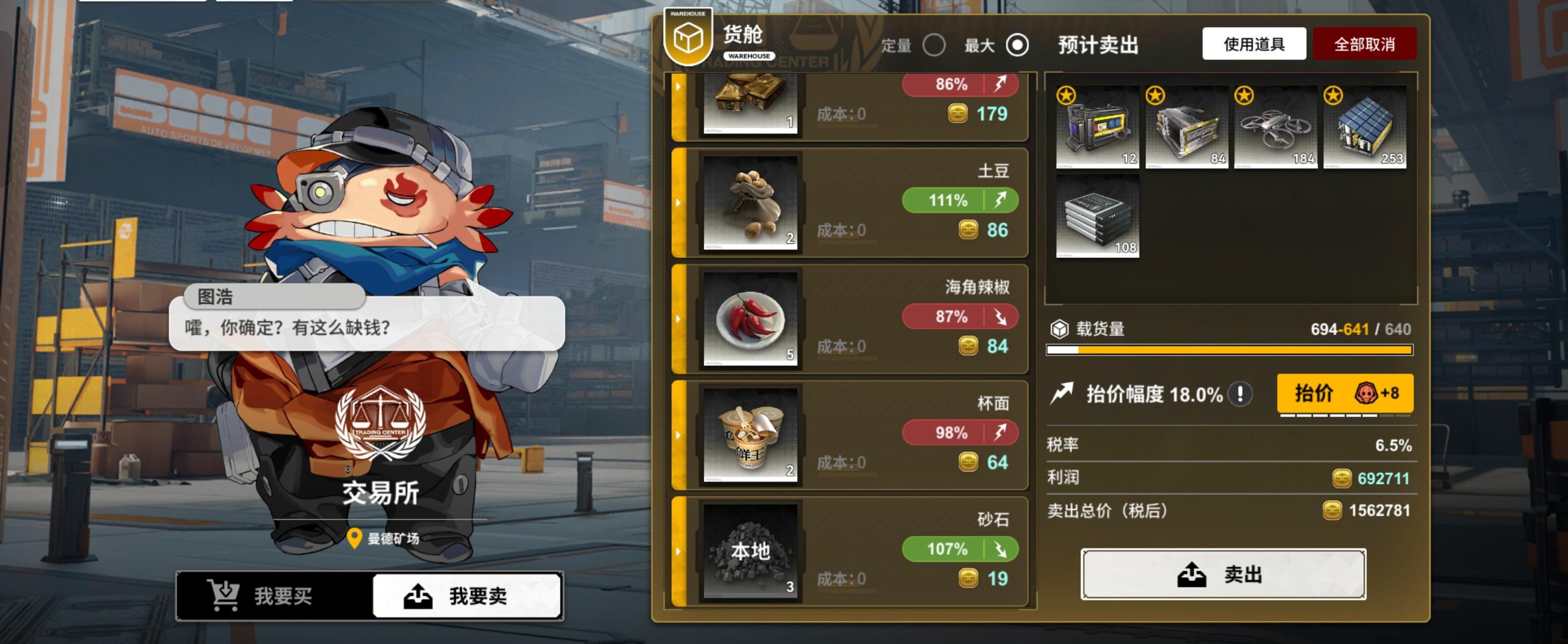 这是在曼德矿场用了2张进货券+砍价2次后买的货,运到阿妮塔能源研究所,抬价2次所能卖的价格