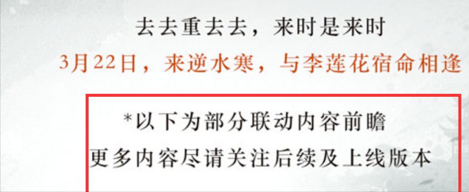 关于跟《莲花楼》的联动官方的消息终于来了,将在3月22日,也就是新赛季的第一天。未赴的东海之约并非结局,李莲花的故事在会呼吸的江湖由你续写!