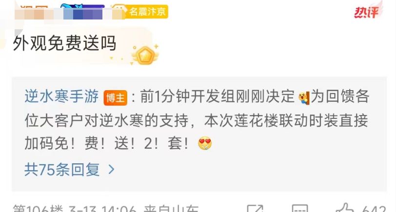 本次联动的3套时装,之前说送一套免费的,今天的最新消息,加赠一套免费的,就是玩家可以从3套联动时装中(3男款3女款)免费自选2套穿回家、和李莲花成为侠友共闯江湖。