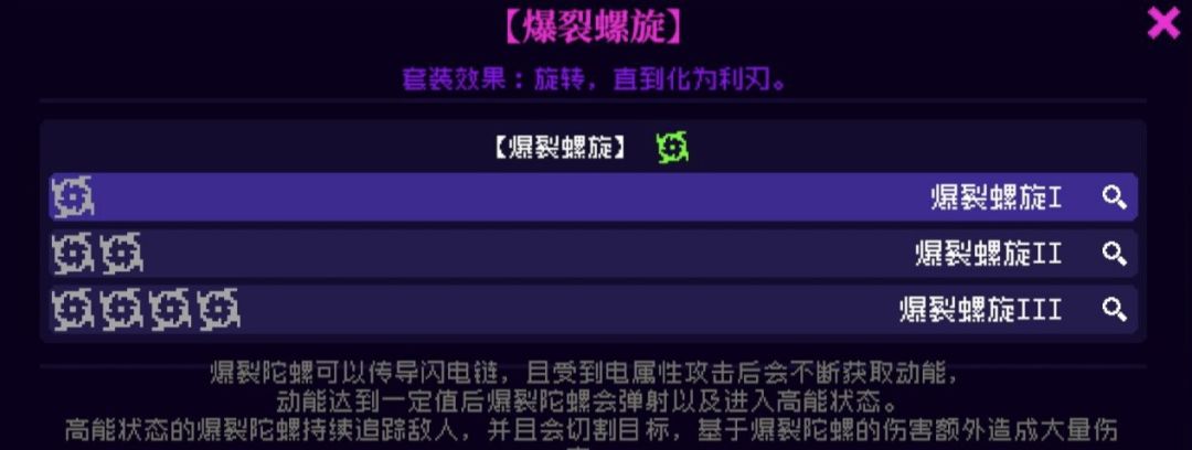 1件套为经典的使用说明书,爆裂陀螺可以作为媒介传导闪电链,并且受到电属性攻击到达一定值后会进入高能状态持续跟踪敌人,期间造成持续伤害。