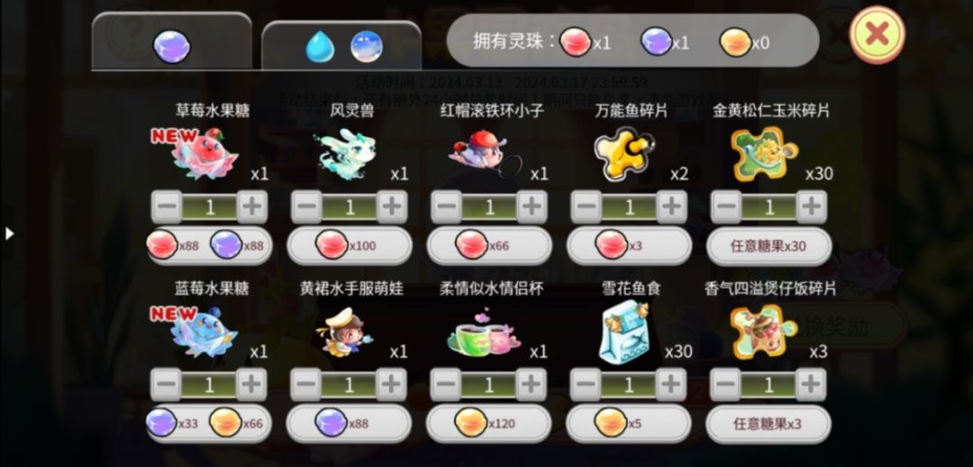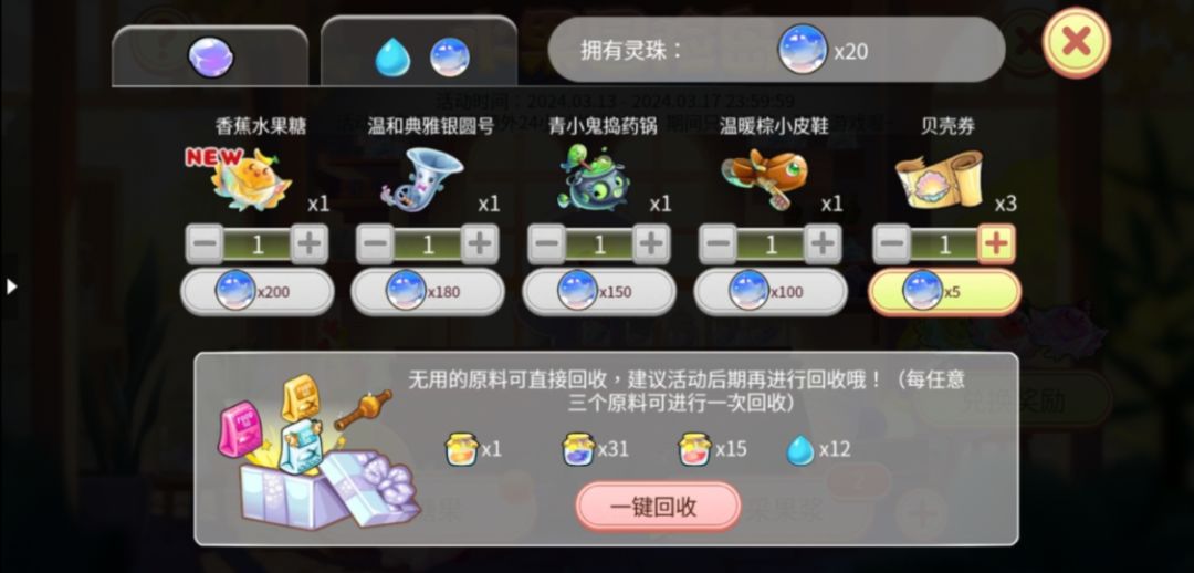 消耗收集到的灵珠可以兑换新鱼和其他奖励哦。无用的原料可以进行回收,建议大家活动结束后再进行回收计划哦。