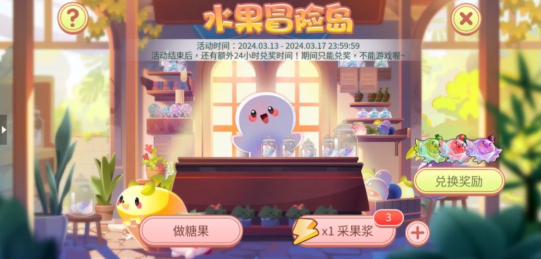 消耗能量挑战水果精灵或者采集露水,就可以获得相应奖励,每一行只能选择其中一个进行挑战。达到一定进度可以额外领取宝箱中的奖励哦。