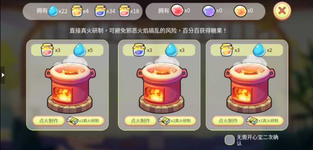 消耗果酱和露水制作糖果,直接点火可能会遇到邪恶火焰搞乱风险导致制糖失败,真火研制百分百获得糖果。