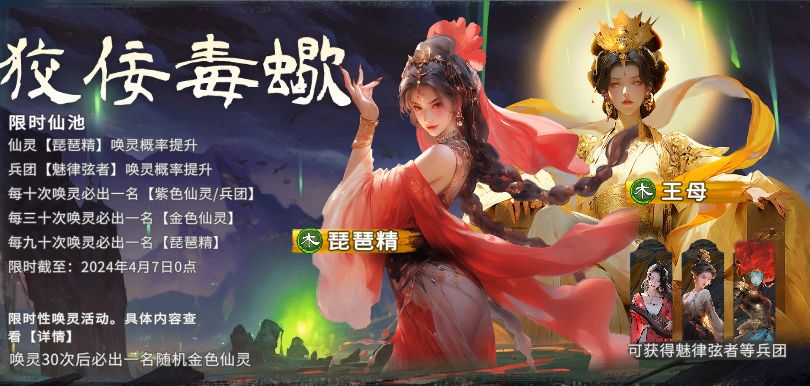 活动期间,以上新增仙灵和兵团可通过限时唤灵【狡佞毒蝎】获得。