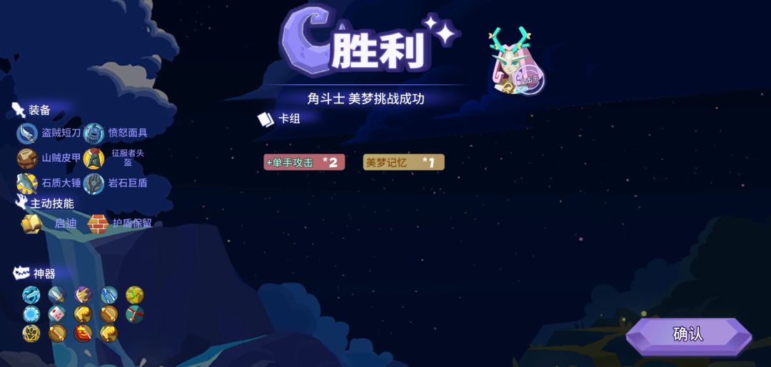 以这次通关为例,输出相关的装备和神器分别是,盗贼短刀(0.25)、愤怒面具(每回合破绽*2)、石质大锤(伤害+5,也正是这个装备导致某种意义上真的是单卡单手攻击通关),冠军头盔(+5力量),三叶草(0.15暴击率),金箍棒(条件伤害+3),生日贺卡(首发大破绽),竹蜻蜓(破盾大破绽),伤害计算:单手攻击原始伤害5+石质大锤5+力量5等于15,盗贼短刀提升0.25等于18.75取整为18,生日贺卡首发破绽*2,等于36。在有护盾的情况下,5+5+5+3+3(运气好拿到了两个金箍棒)=21,盗贼短刀提升至26,破绽提升至52。刚好满足每回合输出50+的条件通关。另外还有0.15的暴击率还没算。极限单卡平A的通关成功在某种程度上意味着,角斗士的几乎任何一张红卡都能够极限单卡通关(除了伤残诅咒、突刺准备、狂暴印记)。